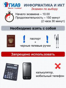 ГИА по программам основного общего образования включает в себя обязательные экзамены по русскому языку и математике, а также экзамены по выбору обучающегося по двум учебным предметам из числа учебных предметов: физика, химия, биология, литература, география, история, обществознание, иностранные языки (английский, французский, немецкий и испанский языки), информатика и информационно-коммуникационные технологии (ИКТ).