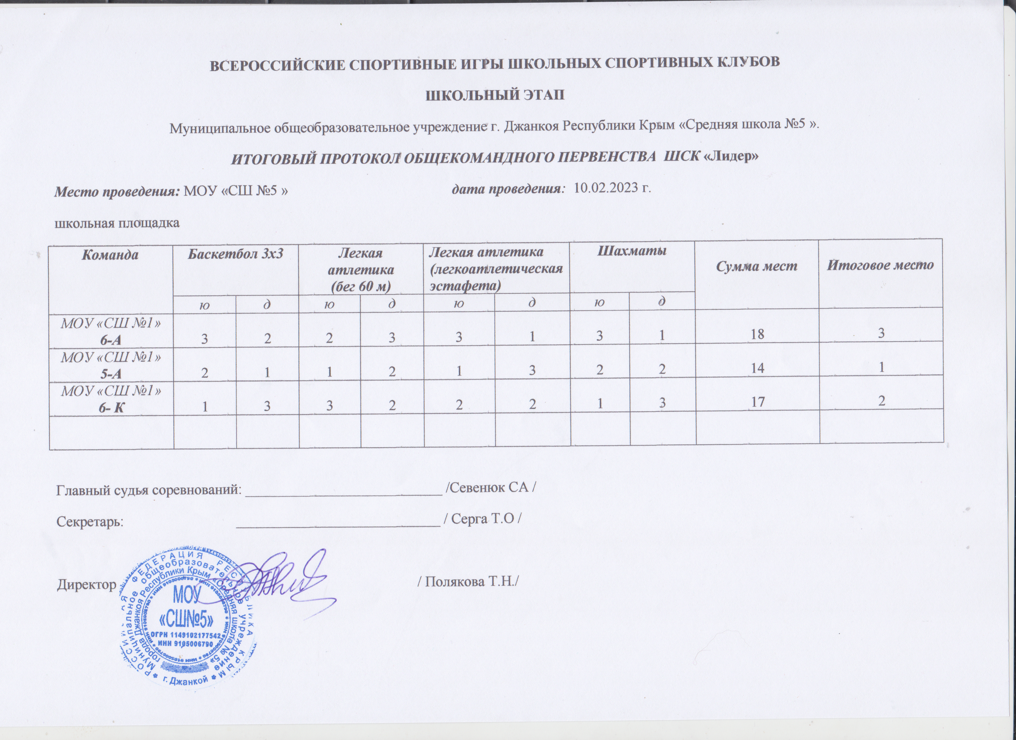 10 февраля 2023г. в МОУ «СШ №1 им. А.А. Драгомировой» состоялись соревнования школьного этапа Всероссийских спортивных игр школьных спортивных клубов. В соревнованиях приняли 48 обучающихся. Целью проведения игр ШСК является укрепление здоровья, вовлечение обучающихся в систематические занятия физической культурой и спортом, пропаганда здорового образа жизни, гражданское и патриотическое воспитание, выявление талантливых детей. Программа соревнований: легкая атлетика (бег 60 м), легкая атлетика (легкоатлетическая эстафета), баскетбол 3х3, шахматы.